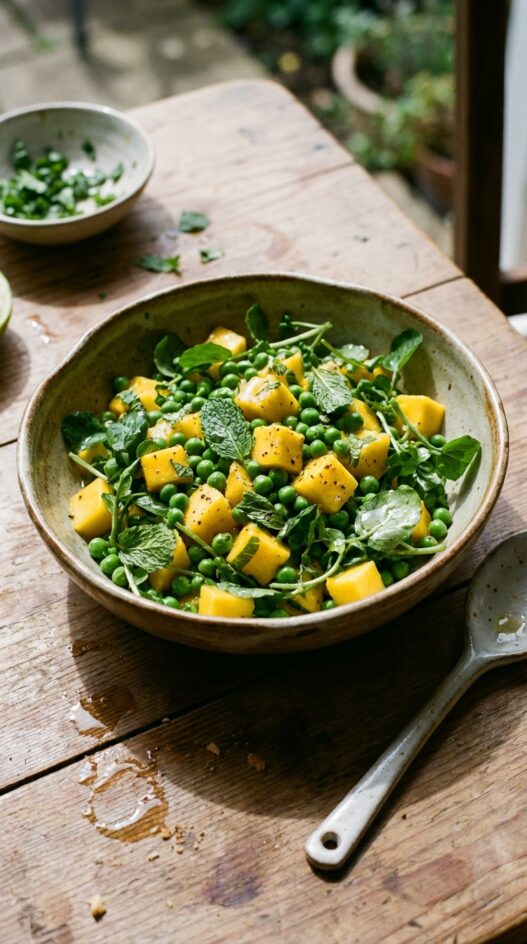 A vibrant and refreshing salad featuring sweet mango, fresh mint, and crispy peas, all tossed in a zesty lime dressing. Perfect for showcasing your garden’s bounty.