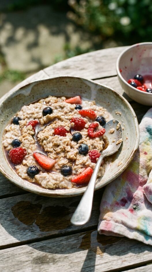 Overnight oats are mostly a texture question, and this version gets it right. Rolled oats soaked in almond milk with a spoonful of yogurt to thicken things, maple syrup instead of honey, and cardamom working quietly in the background. Berries go in before refrigerating so they bleed into the oats overnight, which is exactly what you want. Assembly takes about three minutes the night before. Morning can be slow.