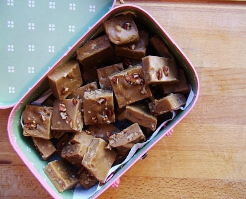 In my house, we have a special occasion breakfast tradition – but it’s not the kind you’d expect. We don’t go in for plates loaded with eggs or dainty French pastries, and as a vegetarian I certainly don’t go in for big meaty masterpieces loaded with bacon and sausage. No, in the Jones household, we buy big boxes of cheap and syrupy maple pecan crisp cereal, and sit and gorge ourselves silly on this twice-yearly treat. There’s something about this flavour combination that makes my tastebuds weep with joy – which is why I was so thrilled to stumble across FakeGinger’s recipe for maple pecan fudge.