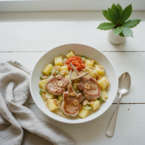 Succulent lamb cutlets meet a hearty potato stew, a twist on patatas bravas. Perfect with Rioja!