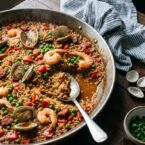 Short-grain Spanish rice like Bomba or Calasparra is the right choice. It absorbs the broth slowly without turning mushy, which gives you the distinct layer of toasted rice at the bottom called socarrat.