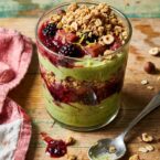 Creamy matcha yogurt is layered with a vibrant rhubarb-blackberry puree and crunchy hazelnut crumble. A delightful dessert or healthy snack!