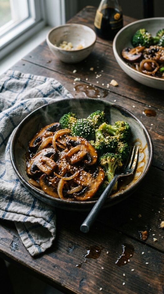 Savory teriyaki glazed mushrooms and broccoli make a hearty vegetarian bowl. Perfect for a quick weeknight dinner!