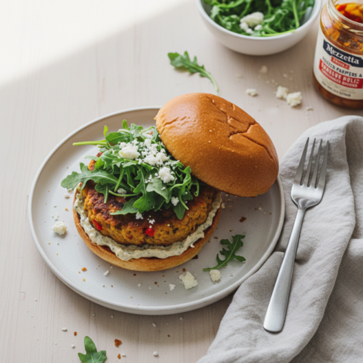 Garbanzo beans are the base of this veggie burger, and are amped up in flavor from the Roasted Red Peppers and Caramelized Onions and a generous spoonful of the Savory Garlic Spread. I also threw in some breadcrumbs and an egg for binding it all together and a handful of arugula arugula for some greens. The combo flavor was awesome along with a nice lathering of the Olive Parmesan and Garlic Everything Spread on a toasted bun and topped with feta cheese and more arugula.