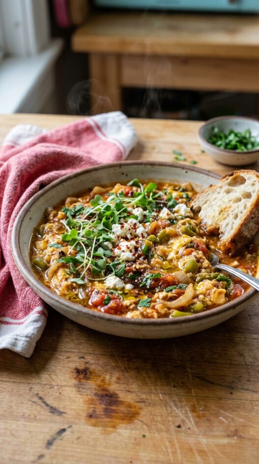 A Turkish twist on scrambled eggs! Soft eggs meet tomatoes, peppers, and a hint of dark chocolate for a surprising umami depth.