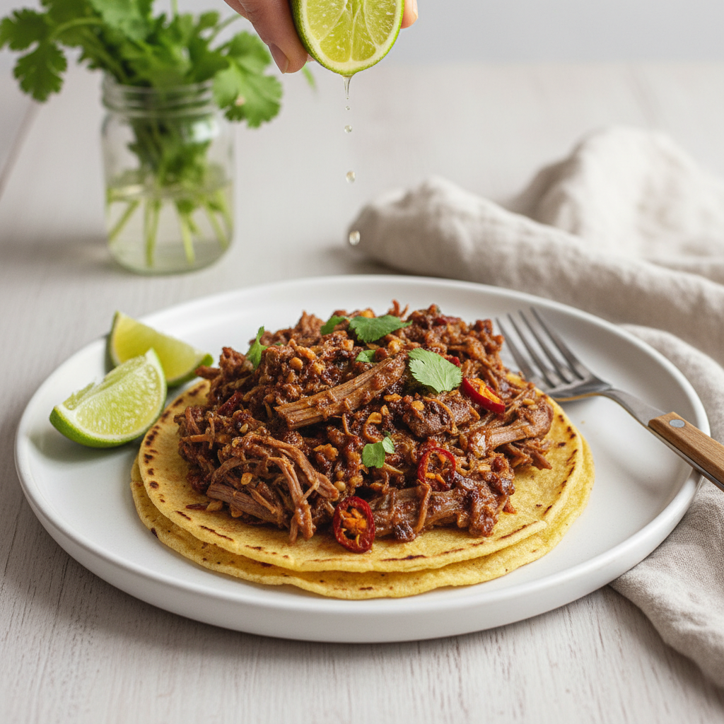 Beef cheeks take time. Four or five hours of braising, then a rest. Plan for that and everything else is simple. The marinade paste here is unusual: peanut butter, cocoa, espresso, cinnamon, dried chili. It sounds like too many things happening at once. It isn’t. The result is dark and deeply savory meat that shreds cleanly, with a sauce that needs nothing but a squeeze of lime and a handful of coriander. Two corn tortillas, a little filling, done. Better cold the next day, honestly.