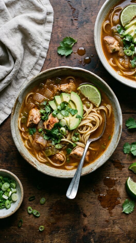 A flavorful Mexican chicken noodle soup with avocado, lime, and cilantro is a perfect cure to cold season and can be made vegetarian by substituting with chickpeas.