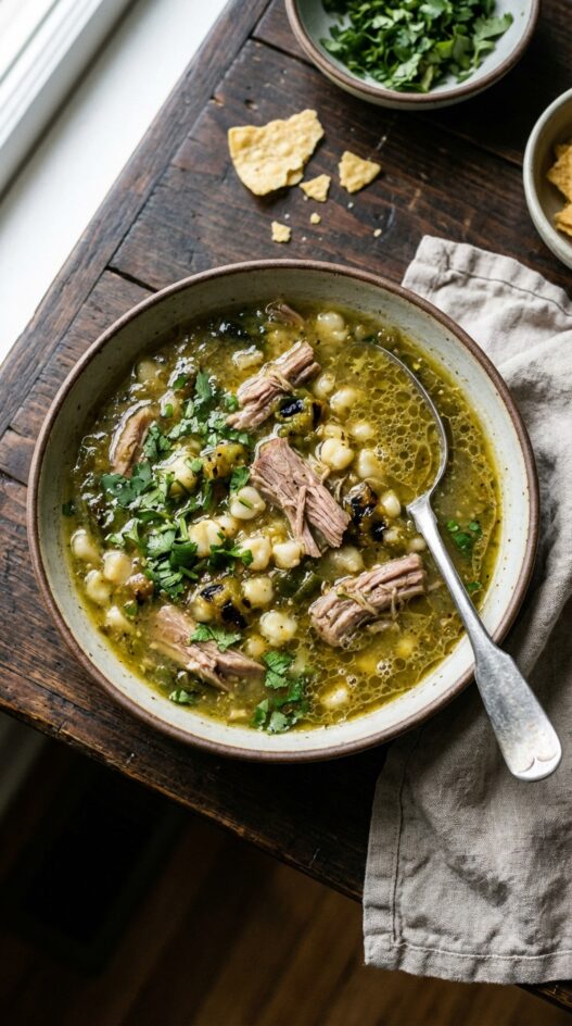 Tender pork simmered in a rich broth with hominy, tomatillos, and warming spices. A hearty and flavorful soup perfect for a chilly evening.