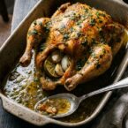 If pan drippings run low, combine olive oil, beer, chicken broth, salsa verde, and cilantro to make additional basting liquid.