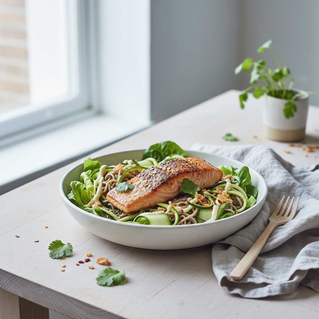 Sweet miso salmon baked to perfection, served over chilled soba noodles with crunchy veggies. A healthy and flavorful weeknight dinner.