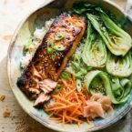 Divide sushi rice among four bowls and place a glazed salmon fillet alongside the steamed bok choy.