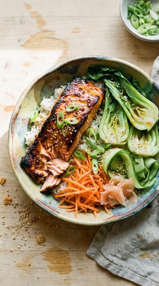 It is a cooking that rewards simplicity: good fish, a solid glaze, and high heat doing most of the work for you. What sets this version apart is the bowl build underneath the salmon.