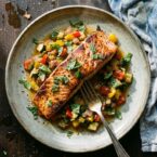 Zesty lime and rum marinade, vibrant pepper salsa, and fresh mint make this salmon a standout dish. Serve with steamed rice, making it a perfect weeknight dinner.