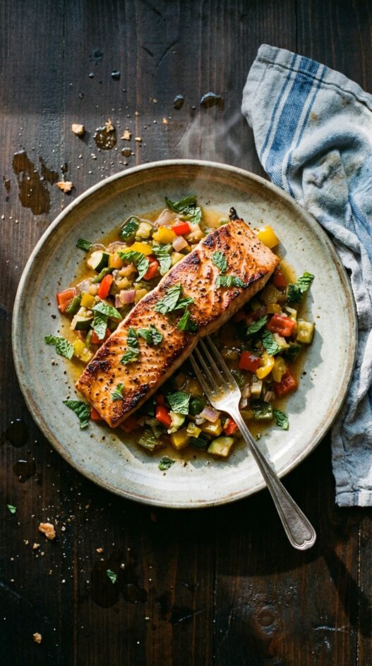 - The sautéed vegetable relish doubles as both a sauce and side.