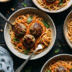 - Assemble the dish: Divide spaghetti between four bowls. Top with romesco sauce and meatballs. Garnish with fresh mint and serve remaining sauce on the side.