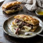 A semolina bread is stacked with buffalo mozzarella cheese, crisp radicchio, olive oil, and red onion from Tropea to make a delicious panino with the flavors of southern Italy.