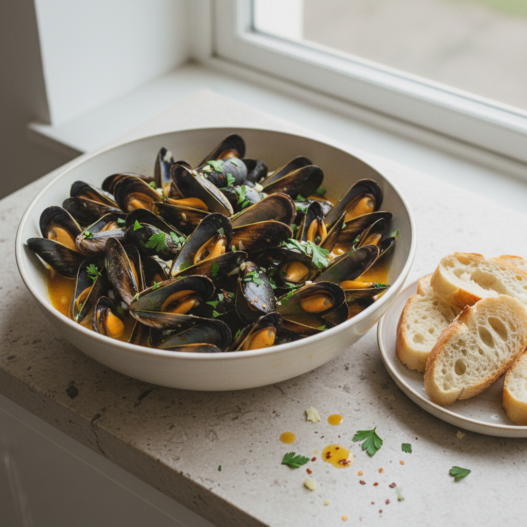 Mussels intimidate people who have never bought them, which is a shame, because they’re faster to cook than almost any protein and cheaper than most. The whole process from cold pot to finished dish takes about fifteen minutes, and most of that is the mussels steaming open in the wine. White wine, garlic, olive oil, parsley, red pepper flakes. That’s an honest list. A lot of recipes overcomplicate this dish, and the result is usually worse, not better. Get the mussels from a fishmonger if you can, not a supermarket bag that’s been sitting in the case for three days. Freshness is the entire story with shellfish.