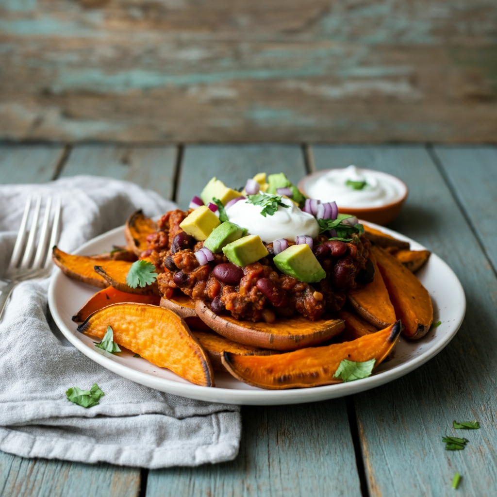 Crispy sweet potato wedges topped with chili and cheese. A fun and flavorful appetizer or snack.