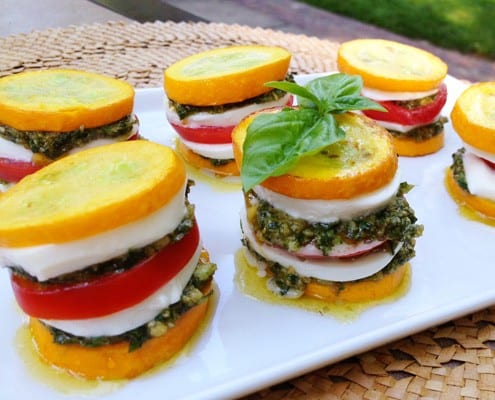 Before I’d even found my next yellow zucchini, I’d already decided what I had to make: A Nashville Capri salad! This towering stack of layered yellow zucchini, heirloom red tomatoes, fresh mozzarella cheese, and basil pesto is the happy result of that inspiration.