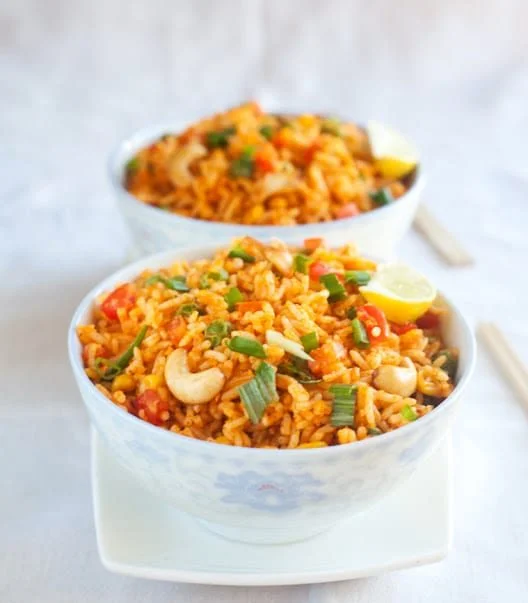 - Transfer the rice to a serving dish. And garnish with chopped and toasted cashews, spring onion greens and chopped tomatoes.