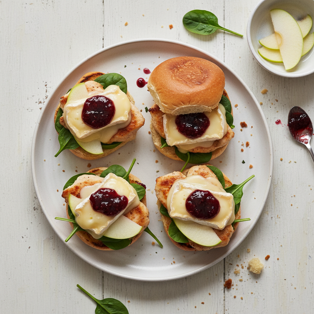 - Place the brie-topped chicken onto the bottom of a slider roll. Add a couple of pieces of spinach, an apple slice, and one teaspoon of jam per slider.