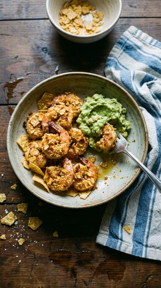Tortilla-crusted shrimp with a zesty taco seasoning. A fun appetizer perfect with crisp white wine.