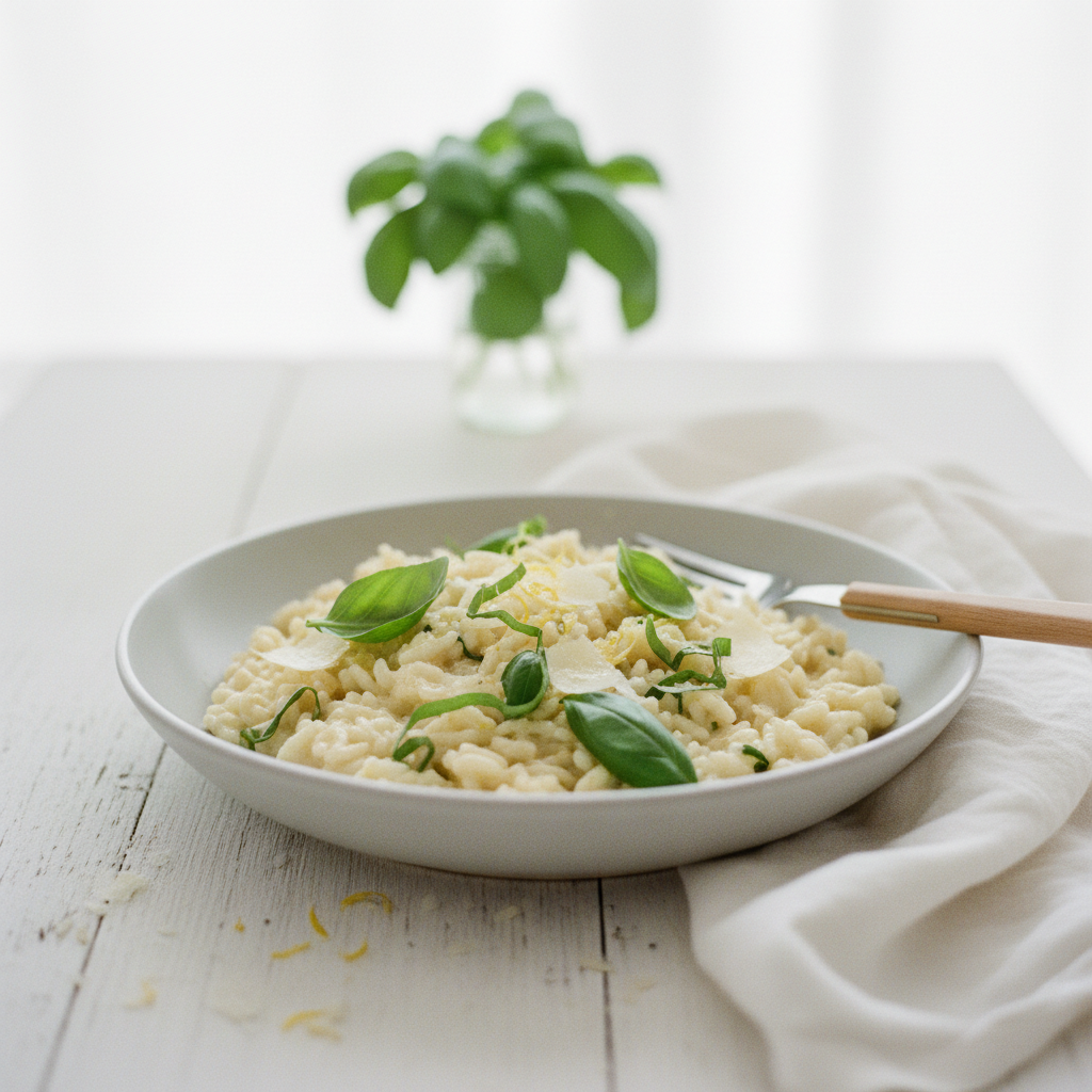 Creamy Arborio rice simmered in fragrant lemon broth, finished with fresh basil. A bright and simple dish perfect for a weeknight dinner.