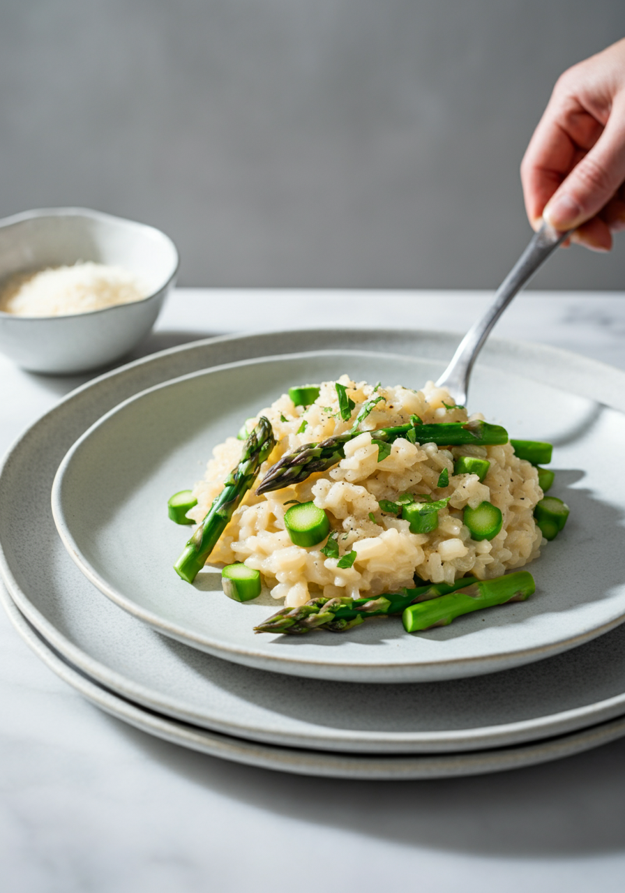 - Remove asparagus from oven, chop into bite-sized pieces, and add to risotto.
