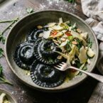 Served with a shaved artichoke salad, this stunning squid ink ravioli with a leek and ricotta filling is the perfect pair with cool Pinot Grigio wine.