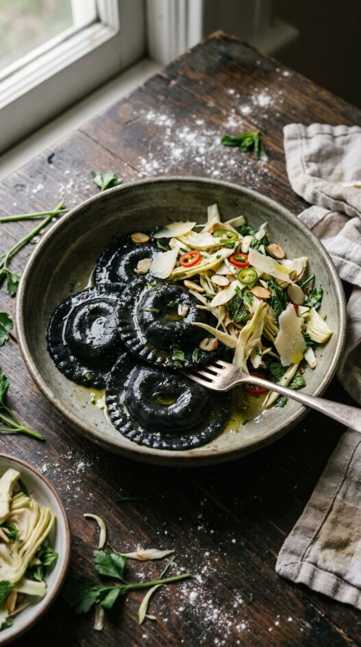 Elegant squid ink ravioli filled with ricotta and vibrant greens, paired with a bright, lemony shaved artichoke salad. A sophisticated yet approachable dish.