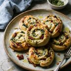 Flaky pizza dough pinwheels are filled with a vibrant spinach pesto and sun-dried tomatoes. A perfect appetizer for your next summer gathering.