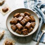 Over a double boiler, I start by melting the butter. I then whisk in honey, cream, and some vanilla extract. Once the liquids have mixed through I then slowly sprinkle in some coconut palm sugar and a bit of large granule Real Salt until it dissolves and mixes in. I allow the caramel to come to a boil and then clip on my candy thermometer, making sure it doesn’t touch the bottom of the pot, and no longer stir the caramel. Once the temperature reaches about 200F, I transfer the top pot with the caramel to the stovetop and over medium-low heat allow it boil to about 235F to finish.