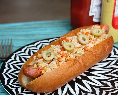 We’re in the dog days of summer, grilling season’s been in full force for a while now, and the question of what’s for dinner comes up again. Well, this jazzy little number is your answer. Inspired by the New Orleans classic sandwich, the Muffuletta, this savory hot dog is topped with a blend of tangy giardiniera (a mix of cauliflower, celery, red bell pepper, carrots, and peperoncini pickled in a vinegar based marinade) and briny green olives. It’s a quick and easy meal that is anything but ordinary.