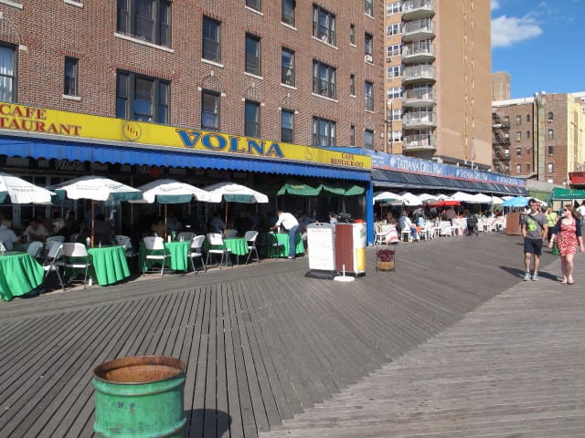 Do yourself a favor and start out with a stroll along the boardwalk. On this sunny Saturday we were lucky enough to witness a chorale group of over 20 people singing Jewish New Year songs while facing the sea; Rosh Hashanah was only a day or two away. At the venerable Volna and Tatiana Restaurants, with their big, round tables on the boardwalk, groups of middle-aged men (at one table) and women (at another) were merrily downing shots of vodka at 2 in the afternoon. If you think that bottle of cold water you’re grabbing out of the cooler is water, take a second look – Tatiana’s cooler is full of cold, half-bottles of Stoli, which won’t quench your thirst as much as water, but might make you decide to take your shirt off – as a number of men at that table we were watching had done – and lemme tell you, the shirtless, suspenders over bulging gut look is all the rage in Little Odessa these days…