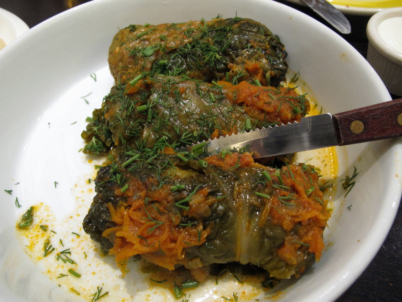Who can go to a Ukranian restaurant and not order stuffed cabbage?Not me. As one of the ladies at our table commented, probably the best stuffed cabbage she’d ever tasted; this version was far from the often too-sweet versions that showed up when I was a kid…