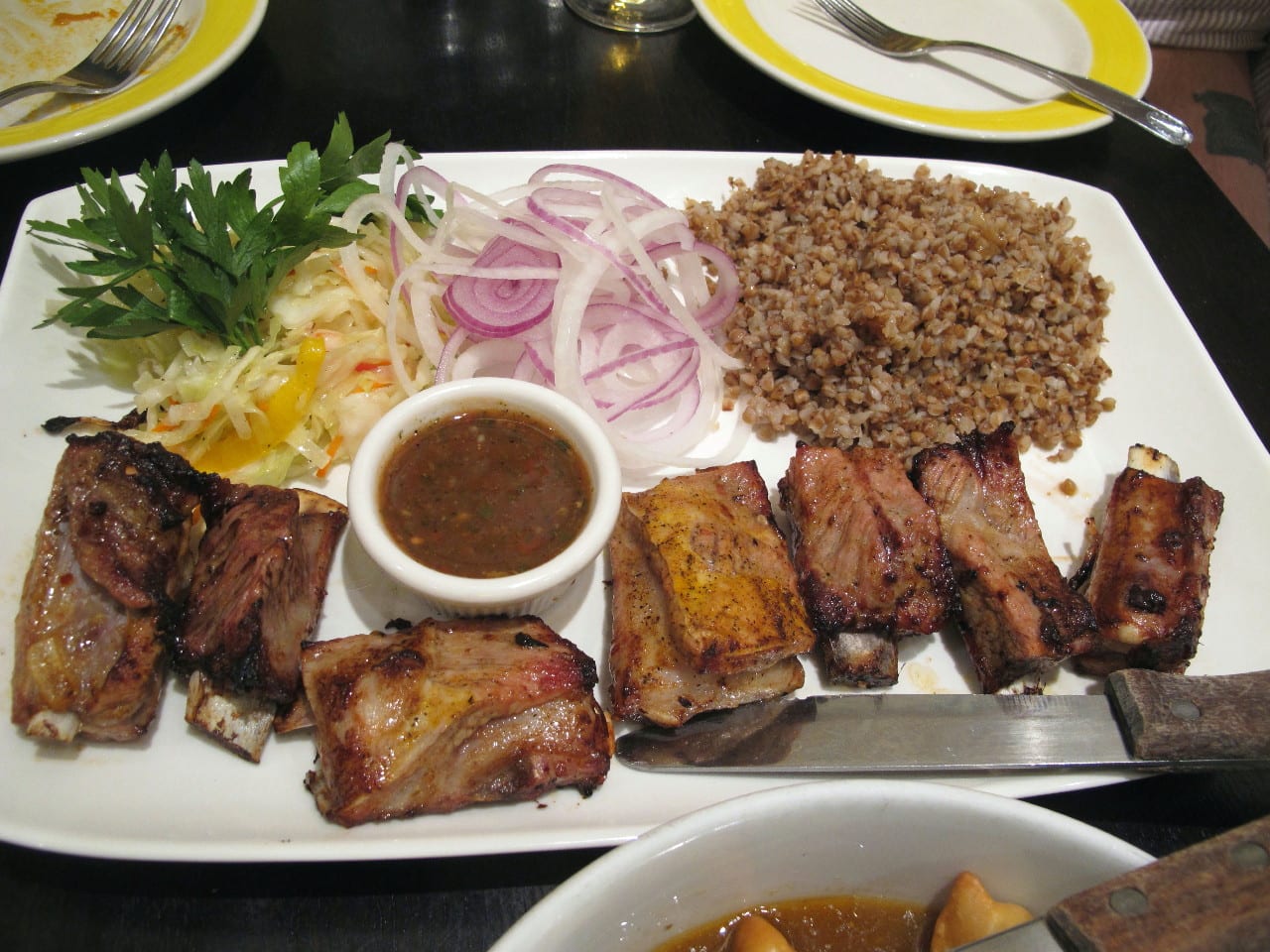 Kebab doesn’t quite describe what you’re served when you order from that section of the menu. Our lamb ribs kebab was actually a platter weighted down with luscious and salty grilled lamb ribs, buckwheat kasha better than my grandma ever made, cabbage slaw and plenty of onions…