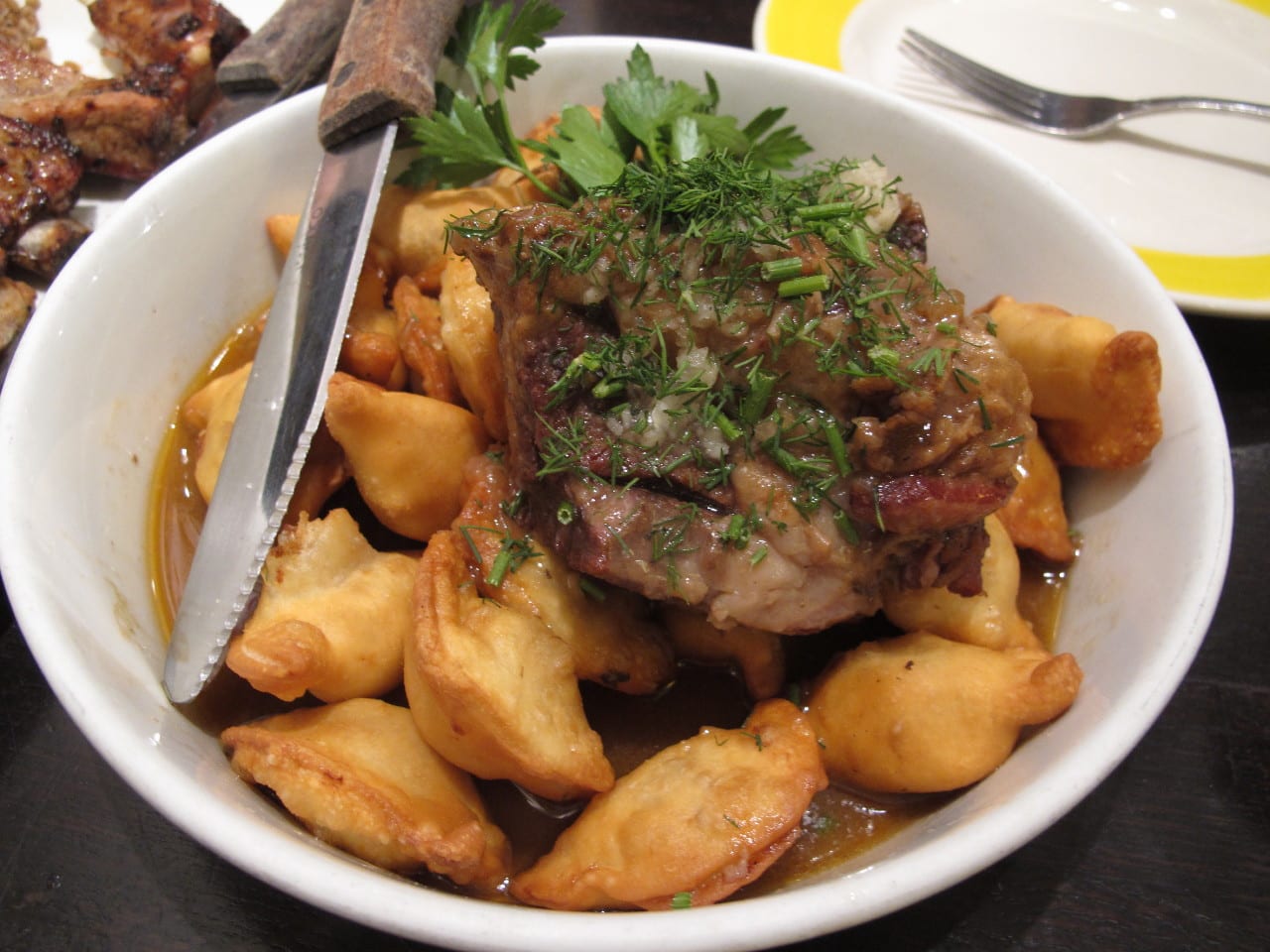 The “Glechik” stew knocked it out of the park. A big hunk of beef shoulder, braised into fork tenderness, served in its juices with a dozen or more fried potato vareniki, all of it strewn with handfuls of parsley and dill. Wow…