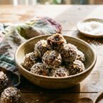 - Form teaspoon-sized pieces of dough into balls and roll in the shredded coconut to coat.
