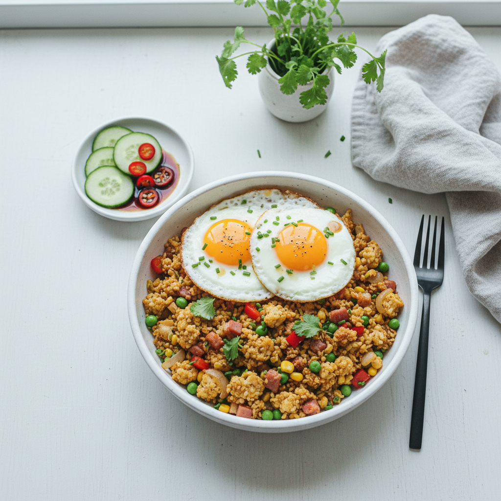 It typically uses riced cauliflower in place of white rice, which is low in carbohydrates and mimics the texture of fried rice when cooked in a hot pan.