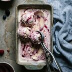 Swirling the strawberry and blueberry sauces into the ice cream creates that beautiful red, white, and blue effect while also adding flavor throughout.