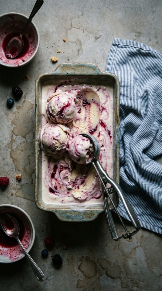 A refreshing, no-churn ice cream recipe perfect for summer. Layers of creamy ice cream and homemade berry sauces create a vibrant, delicious dessert.