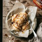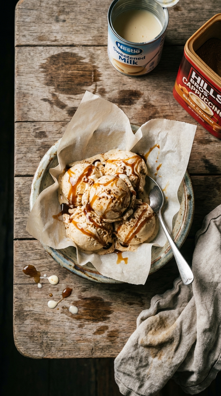 I’ve used Hills Bros Salted Caramel Cappuccino to make this ice cream. Yep, I sure did. It’s actually doing double duty in both the ice cream and the salted caramel syrup.