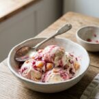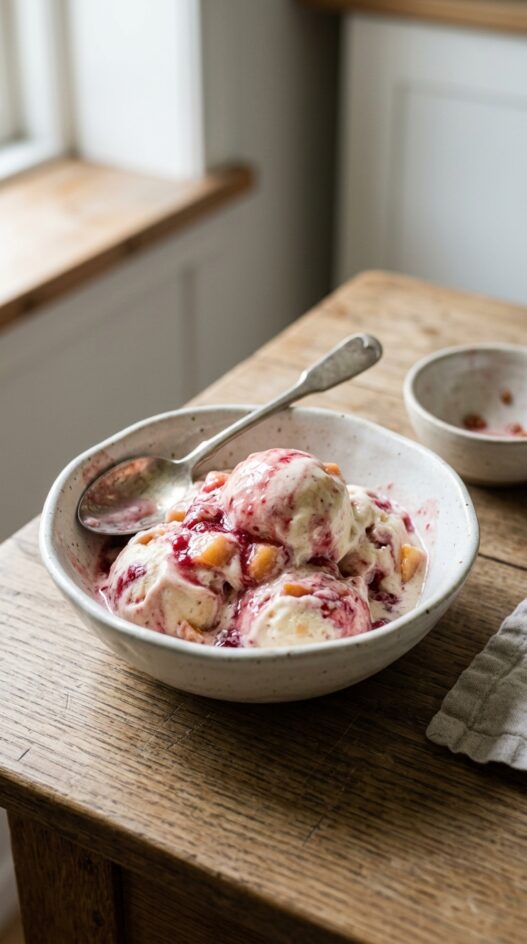 A luxuriously smooth nectarine gelato artfully swirled with a vibrant homemade raspberry syrup, creating a fail-safe summertime treat that requires no ice cream maker.