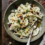 A crisp and refreshing salad featuring thinly shaved raw cauliflower, toasted hazelnuts, and sweet dried berries, all tossed in a zesty apple cider vinaigrette.