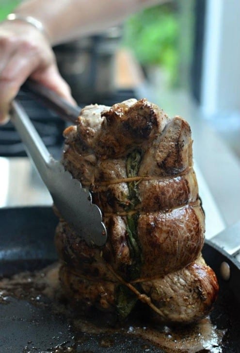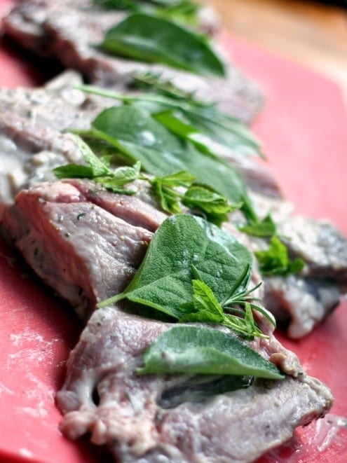 - Season the meat all over with salt and pepper. Lay the handful of herbs inside and roll up the meat, securing it with several pieces of string.