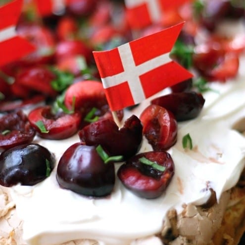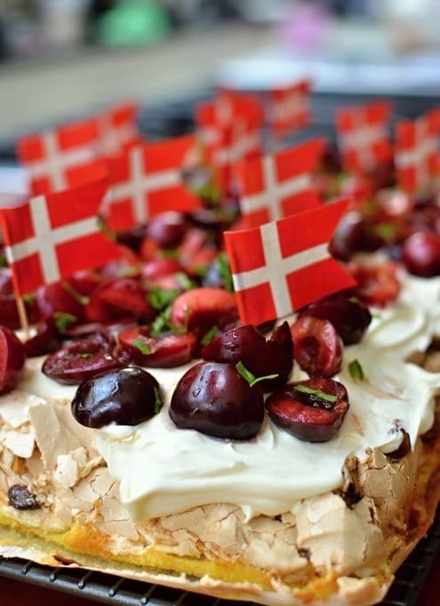 The dark, dense and sweet cherries are the perfect match for this light cake. I toss them in Danish cherry wine to boost the flavor, but cherry liquor works beautifully as well. The cake is a winder all year around – topped with every fruit of the season, ranging from the first baked rhubarb to the late autumn apples.