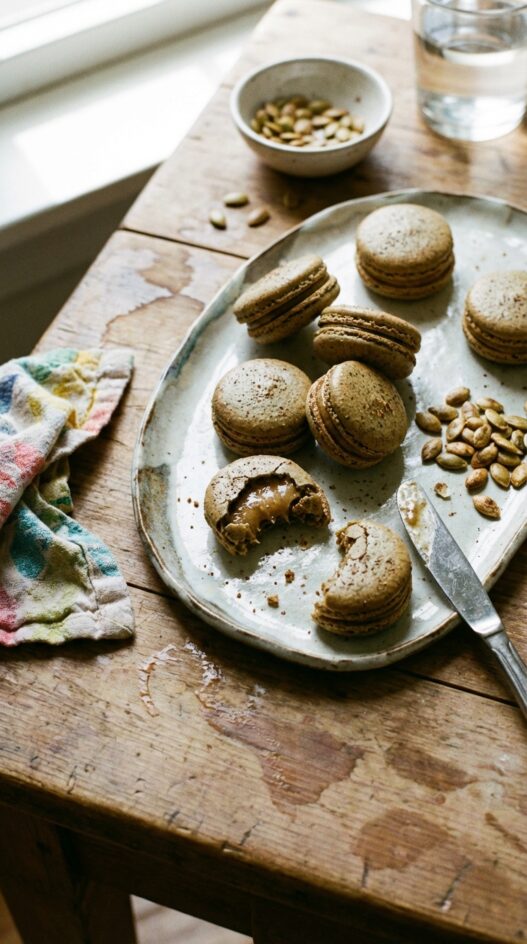 The shells crack the same way. They have feet. They are slightly chewy in the center and crisp on the outside. If you handed someone a macaron without telling them, they would not guess the base is pumpkin seeds.