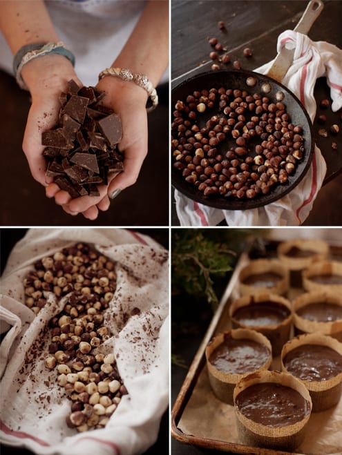 - Toast the hazelnuts in a dry frying pan until the aroma wafts upwards and the nuts are golden-brown in parts: keep shaking the pan so that they don’t burn on one side and stay too pallid on others. Transfer to a plate and let cool. This is imperative: if they go on the ganache while hot, it’ll turn oily. (Believe me, I speak from experience.)