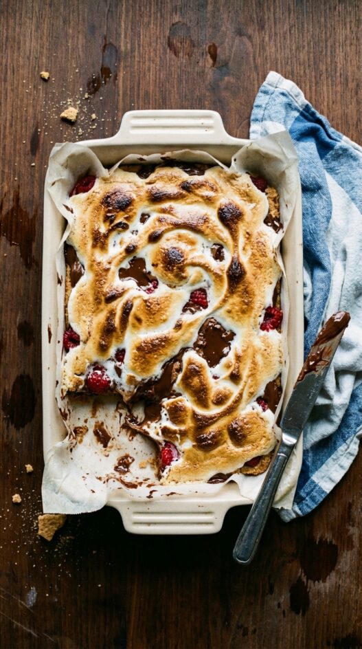 Gooey marshmallow topping, rich chocolate, and tart raspberries make these bars irresistible. A fun twist on a classic smore!