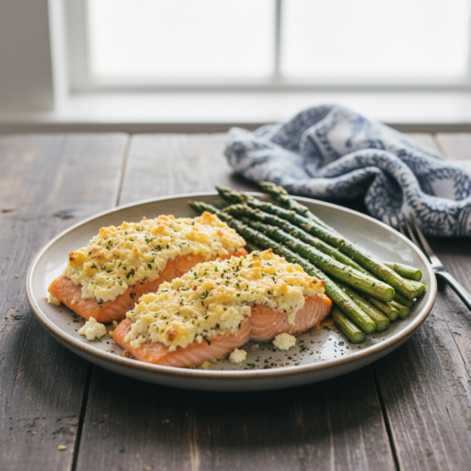 Salmon is full of health benefits, but I know many people are either intimidated to make fish at home, or they are worried their family won’t like the taste. Does that sound familiar? If so, I highly recommend that you give this recipe a try! This meal is so easy to cook up, and the parmesan garlic topping on the fish keeps the salmon moist and gives it such a great flavor. This dish is sure to please everyone!